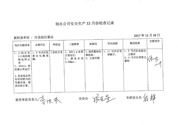 應(yīng)急加壓泵站2017年12月安全生產(chǎn)檢查記錄