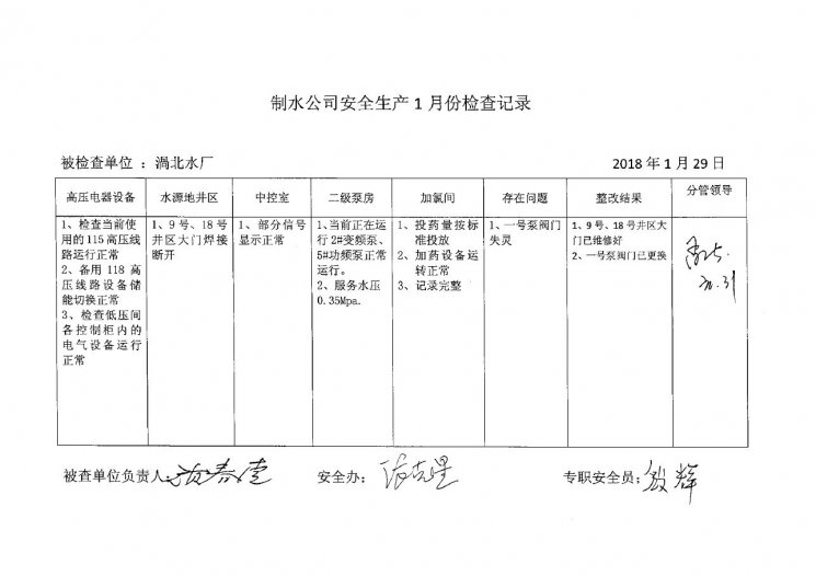渦北水廠2018年1月安全生產(chǎn)檢查記錄