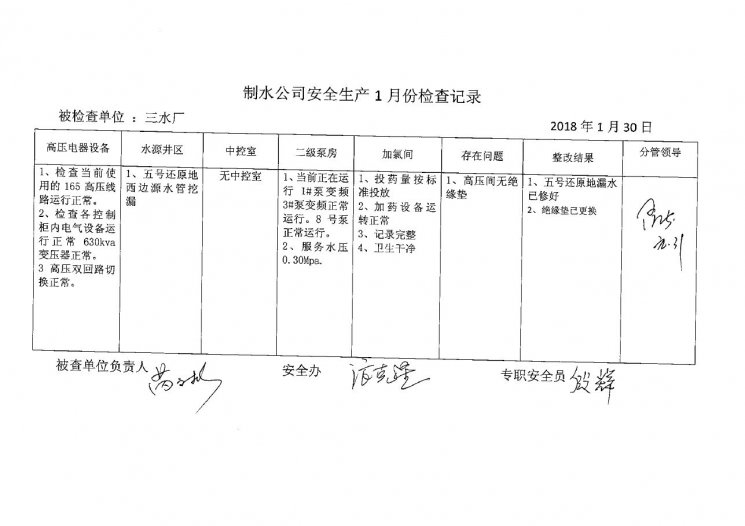 三水廠2018年1月安全生產(chǎn)檢查記錄
