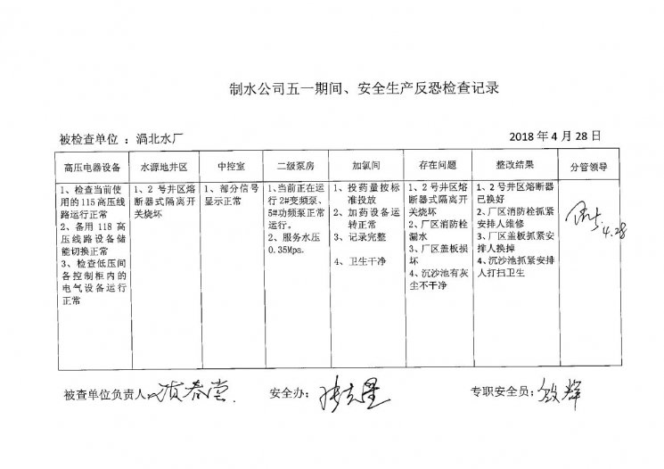 渦北水廠2018年4月安全生產(chǎn)檢查記錄