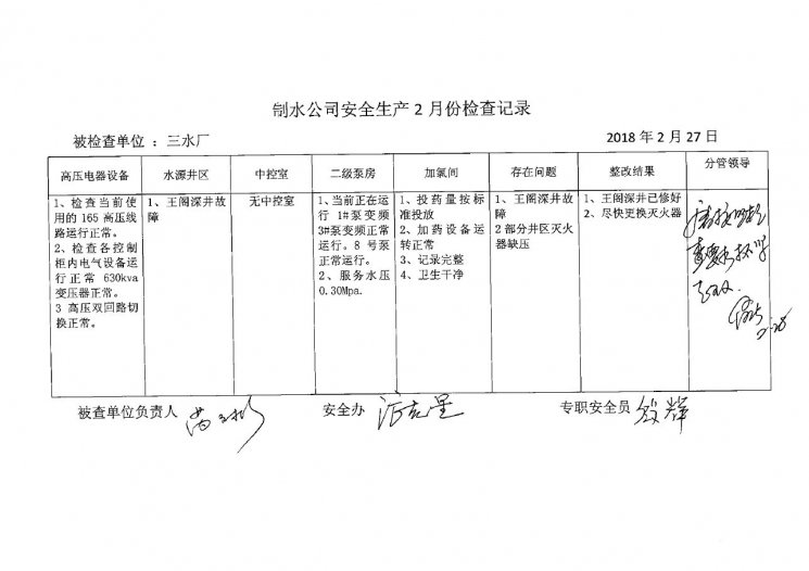 三水廠2018年2月安全生產(chǎn)檢查記錄