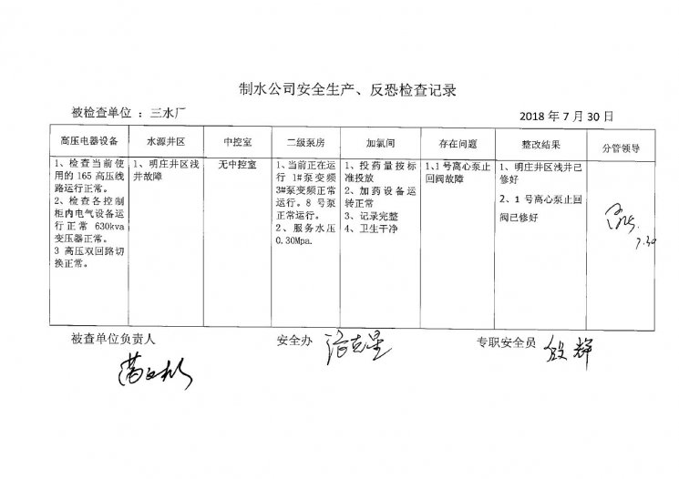 三水廠2018年7月安全生產(chǎn)檢查記錄