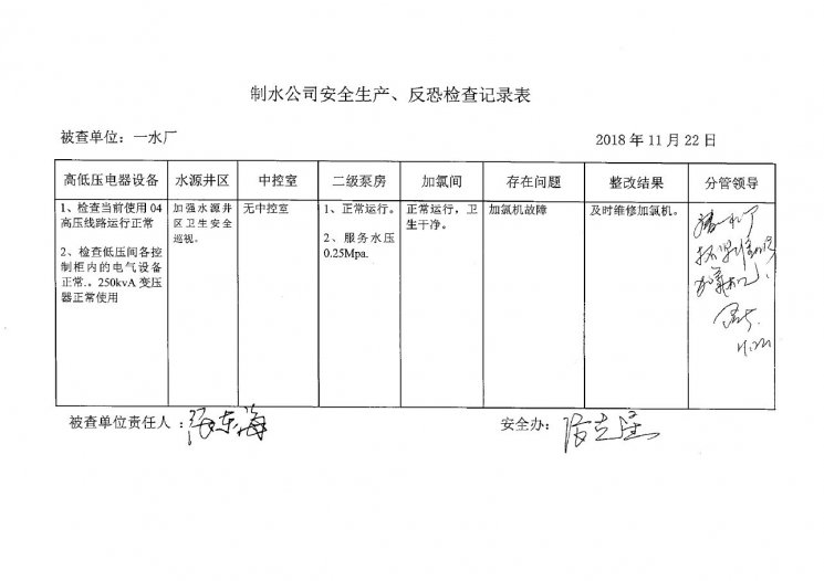 一水廠2018年11月安全生產(chǎn)檢查記錄