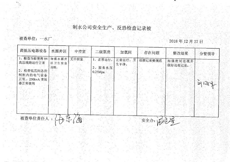 一水廠2018年12月安全生產(chǎn)檢查記錄