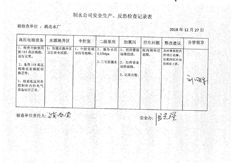 渦北水廠2018年12月安全生產(chǎn)檢查記錄