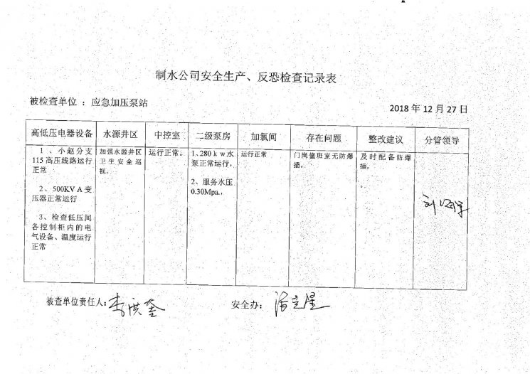 加壓泵站2018年12月安全生產(chǎn)檢查記錄