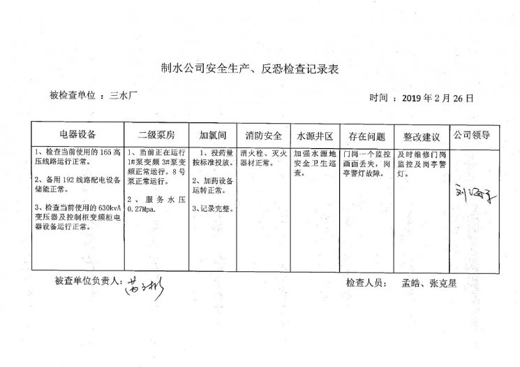 三水廠2019年2月安全生產(chǎn)檢查記錄