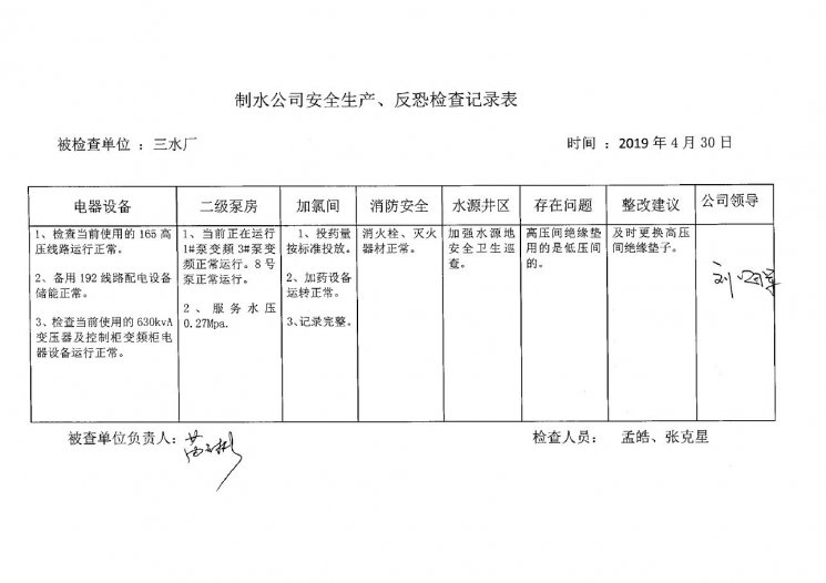 三水廠2019年4月安全生產(chǎn)檢查記錄