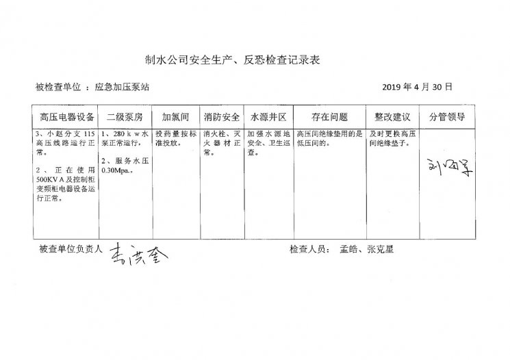 加壓泵站2019年4月安全生產(chǎn)檢查記錄
