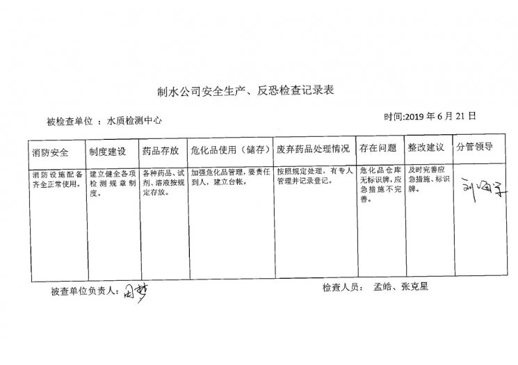 水質(zhì)檢測中心2019年6月安全生產(chǎn)檢查記錄