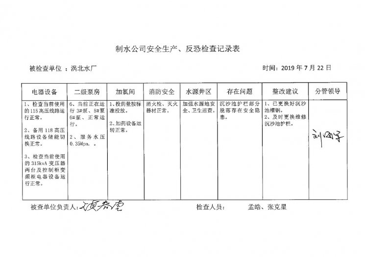 渦北水廠2019年7月安全生產(chǎn)檢查記錄