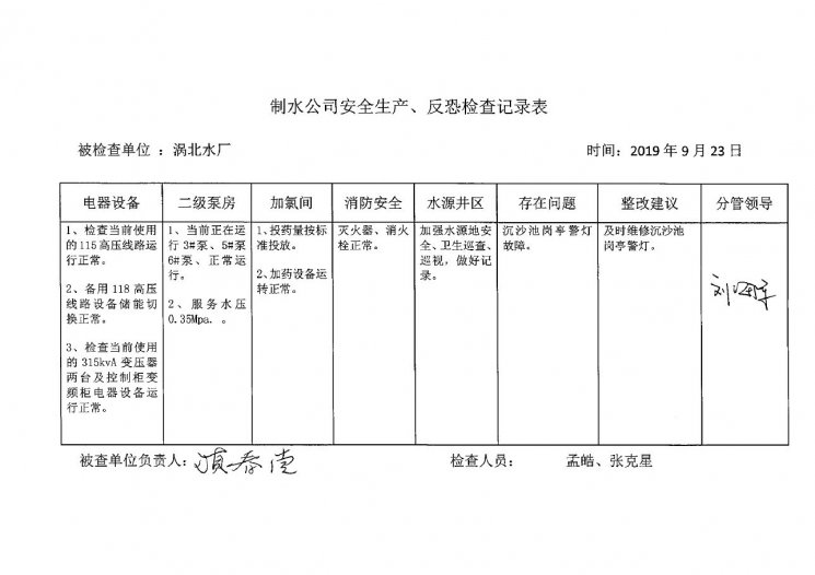渦北水廠2019年9月安全生產(chǎn)檢查記錄