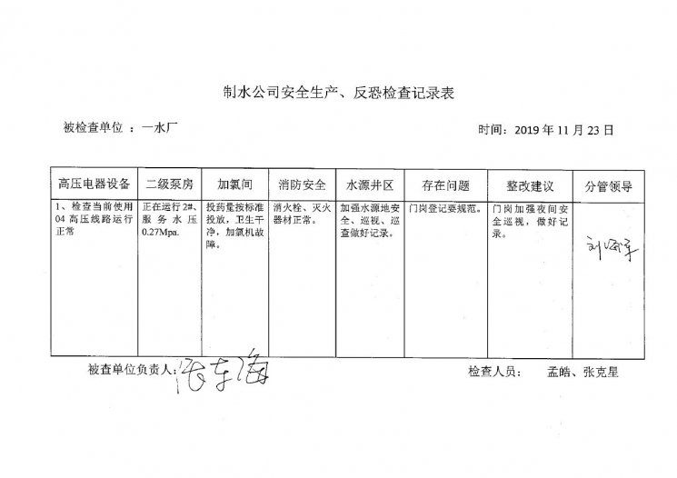 一水廠2019年11月安全生產(chǎn)檢查記錄