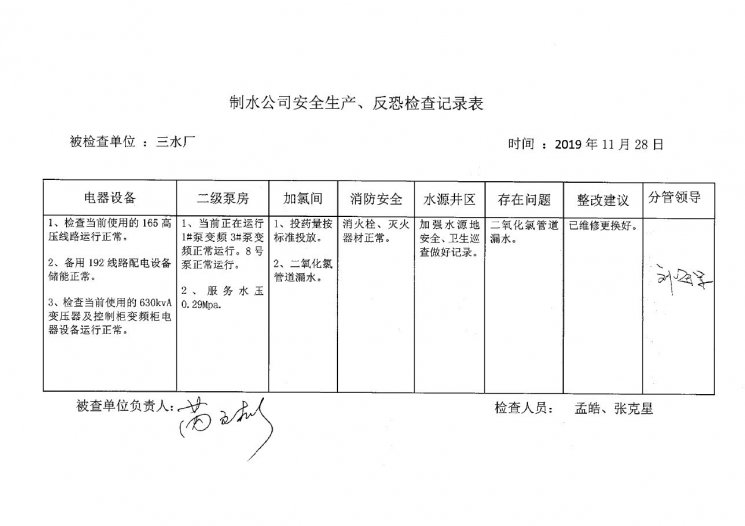 三水廠2019年11月安全生產(chǎn)檢查記錄