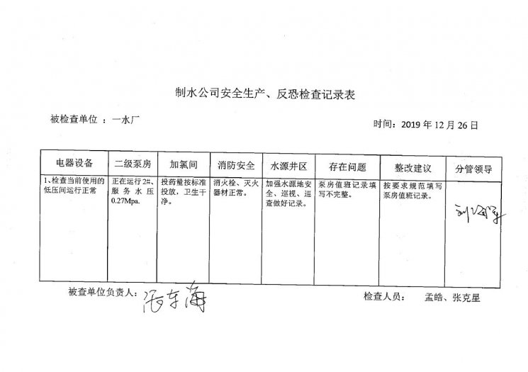 一水廠2019年12月安全生產(chǎn)檢查記錄