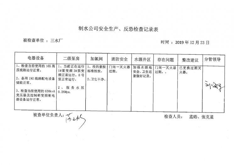 三水廠2019年12月安全生產(chǎn)檢查記錄