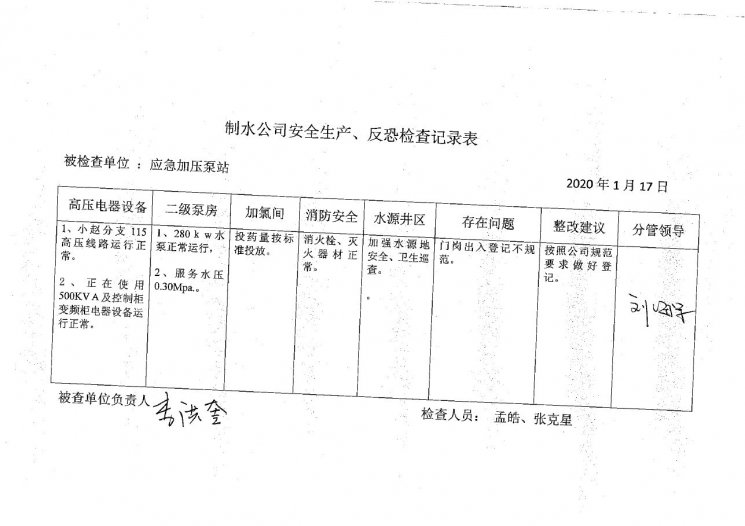 應(yīng)急加壓泵站2020年1月安全生產(chǎn)檢查記錄