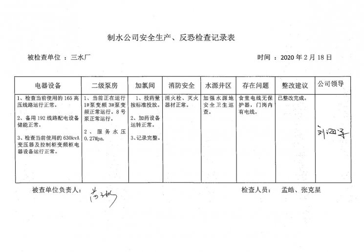 三水廠2020年2月安全生產(chǎn)檢查記錄