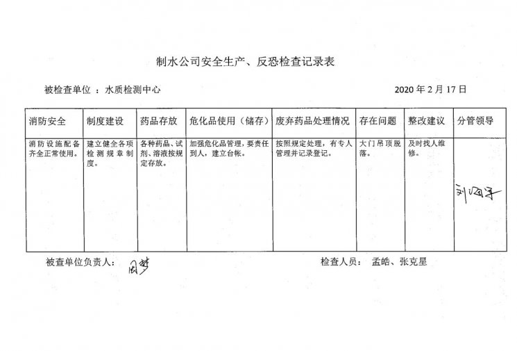 水質(zhì)檢測(cè)中心2020年2月安全生產(chǎn)檢查記錄