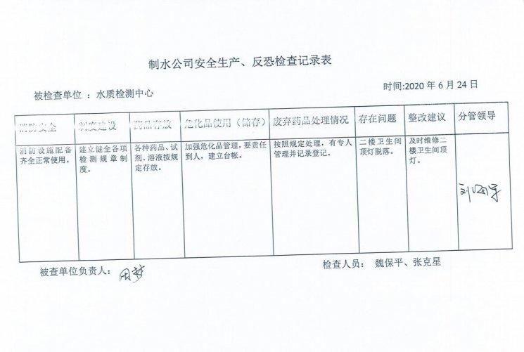水質(zhì)檢測中心2020年6月安全生產(chǎn)檢查記錄