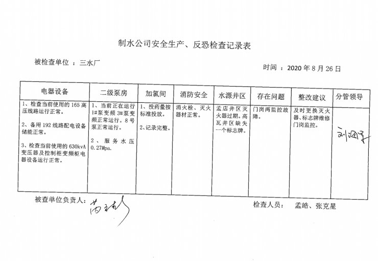 三水廠2020年8月安全生產(chǎn)檢查記錄