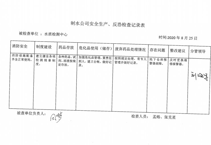 水質(zhì)檢測(cè)中心2020年8月安全生產(chǎn)檢查記錄