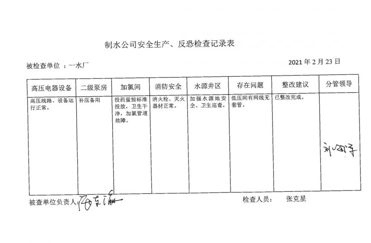 一水廠2021年2月安全生產(chǎn)檢查記錄