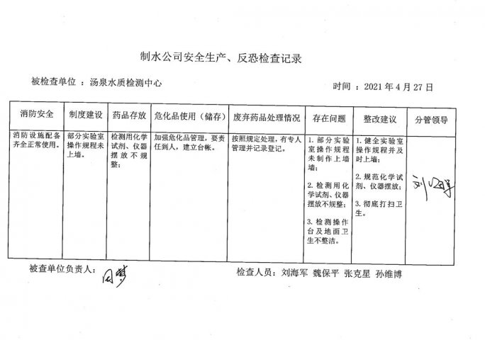 水質(zhì)檢測中心2021年4月安全生產(chǎn)檢查記錄