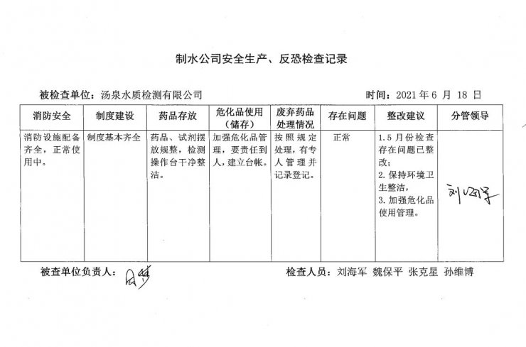 湯泉水質(zhì)檢測(cè)中心2021年6月安全生產(chǎn)檢查記錄