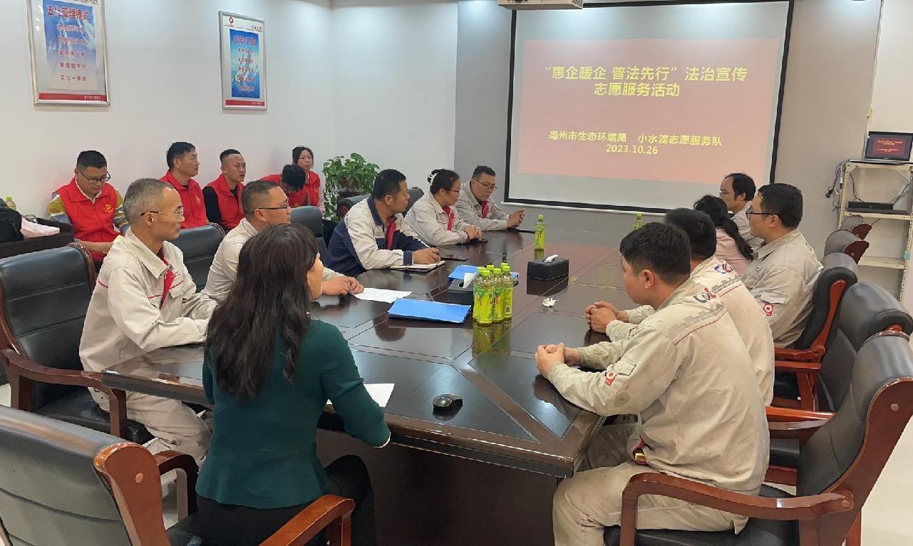 2023年10月26日,亳州市生態(tài)環(huán)境局聯(lián)合制水公司小水滴志愿者服務(wù)隊(duì)在蚌埠中聯(lián)水泥有限公司亳州分公司開展了“惠企暖企 普法先行”法治宣傳志愿服務(wù)活動,旨在通過知識講座深入宣傳貫徹習(xí)近平法治思想,弘揚(yáng)法治精神,傳播法治文化,提高企業(yè)的法治意識。